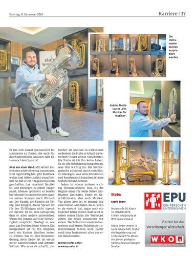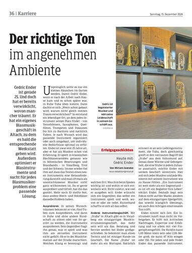 Cedric Ender ist gerade 25. Und doch hat er bereits verwirklicht, wovon mancher träumt. Er hat ein eigenes Blasmusikgeschäft in Altach, zu dem es bald die entsprechende Werkstatt geben wird. Außerdem optimiert er Blasinstrumente und sucht für jedes Blasmusikerproblem eine passende