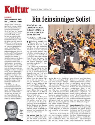 Interview. Der aus Bregenz stammende Cellist Kian Soltani war am Wochenende mit dem SOV zu erleben. Soltani erhielt im vergangenen Dezember den Credit Suisse Young Artist Award. Dabei ist auch ein Konzert mit den Wiener Philharmonikern beim Lucerne Festival inbegriffen.