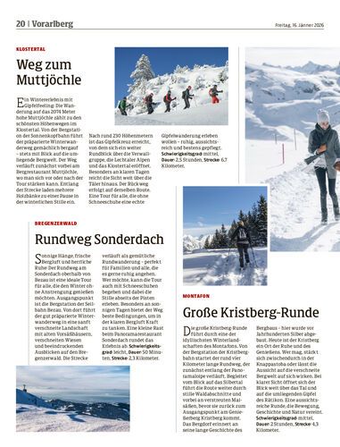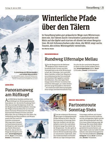 In Vorarlberg laden gut präparierte Wege zum Winterwandern ein. Sie führen durch verschneite Landschaften mit Blick auf die Gipfel und starten oft direkt bei einer Bergstation. Ob mit Schneeschuhen oder ohne, die NEUE zeigt sechs Touren, die echtes Wintergefühl vermitteln.