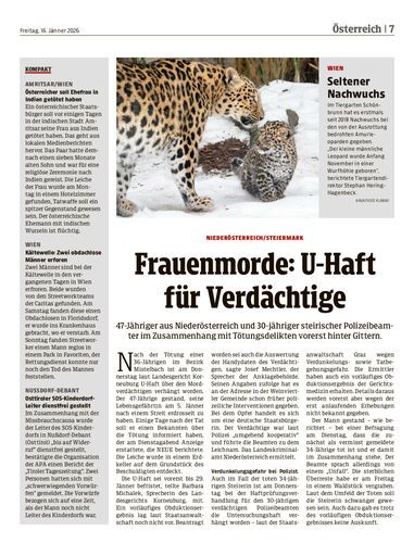 47-Jähriger aus Niederösterreich und 30-jähriger steirischer Polizeibeamter im Zusammenhang mit Tötungsdelikten vorerst hinter Gittern.