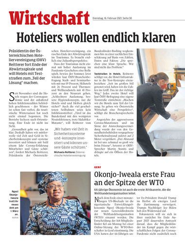 Präsidentin der Österreichischen Hoteliervereinigung (OHV) Reitterer fort Ende der Abwärtsspirale und will Hotels mit Teststraßen zum „Teil der Lösung“ machen.