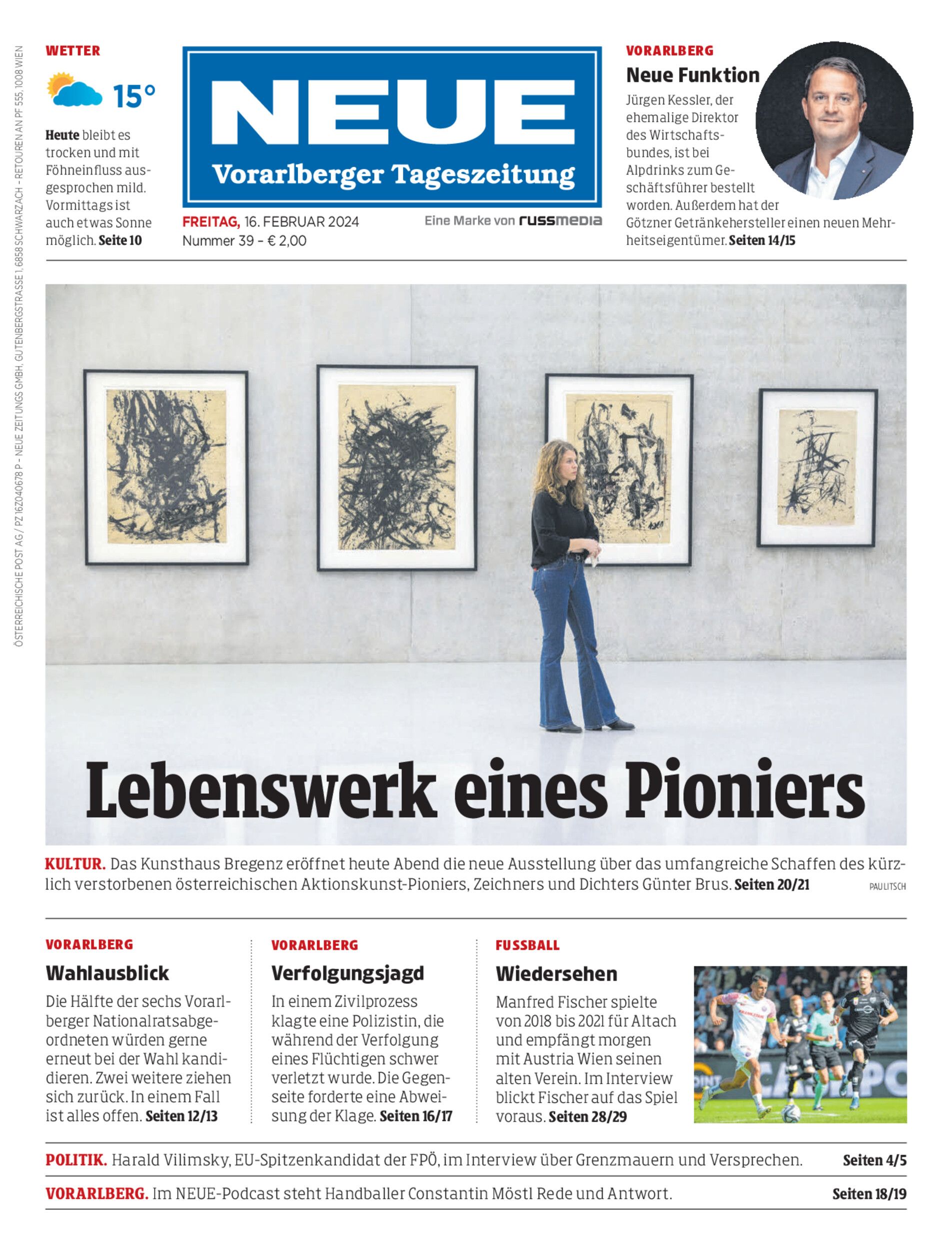 Heute um 19 Uhr eröffnet die Ausstellung des österreichischen Aktionismuskünstlers „Günter Brus“ im Kunsthaus Bregenz.