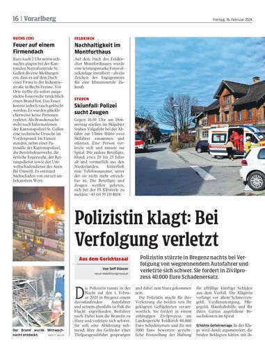 Polizistin stürzte in Bregenz nachts bei Verfolgung von wegrennendem Autofahrer und verletzte sich schwer. Sie fordert in Zivilprozess 40.000 Euro Schadenersatz.