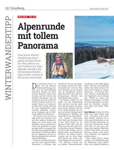 Eine letzte Winterwanderung unternahm Hertha Glück. Der Weg führte sie von Fraxern zur Alpe Maisäß und über die Schwimmersbodenalpe wieder zurück in die Kriasi-Gemeinde.