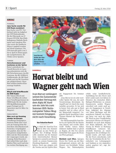 Ivan Horvat verlängert seinen bis Saisonende laufenden Vertrag mit dem Alpla HC Hard um ein Jahr bis zum Sommer 2019. Nationalspieler Tobias Wagner kommt hingegen nicht nach Vorarlberg.