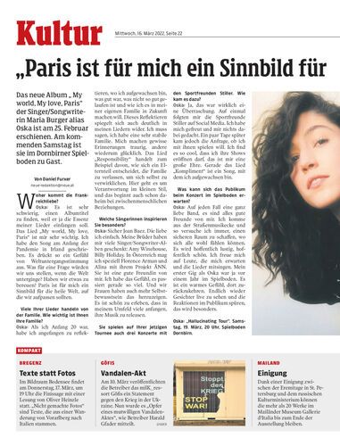 Das neue Album „ My world, My love, Paris“ der Singer/Songwriterin Maria Burger alias Oska ist am 25. Februar erschienen. Am kommenden Samstag ist sie im Dornbirner Spielboden zu Gast.