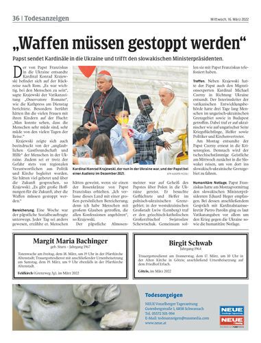 Papst sendet Kardinäle in die Ukraine und trifft den slowakischen Ministerpräsidenten.