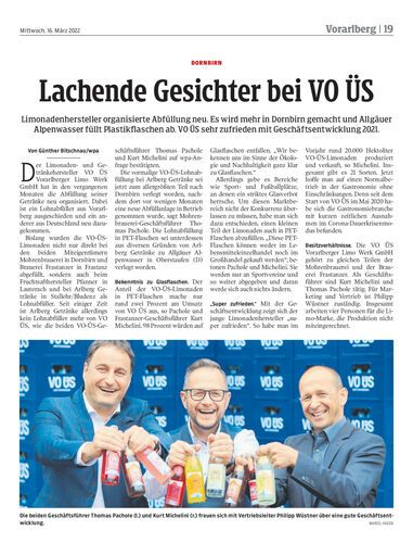 Limonadenhersteller organisierte Abfüllung neu. Es wird mehr in Dornbirn gemacht und Allgäuer Alpenwasser füllt Plastikflaschen ab. VO ÜS sehr zufrieden mit Geschäftsentwicklung 2021.