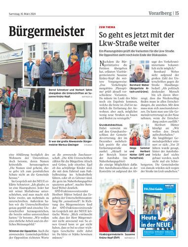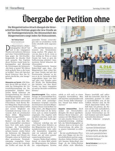 Die Bürgerinitiative Altach übergab die Unterschriften ihrer Petition gegen die Lkw-Straße an die Vizebürgermeisterin. Die Abwesenheit des Bürgermeisters sorgt indes für Diskussionen.