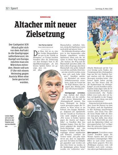 Der Cashpoint SCR Altach gibt sich vor dem Auftakt in die Qualigruppe selbstbewusst, im Kampf um Europa möchte man ein Wörtchen mitreden. Heute soll um 17 Uhr mit einem Heimsieg gegen Austria Wien eine Serie gestartet werden.