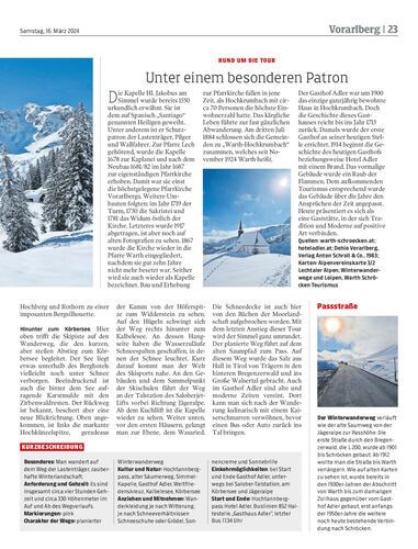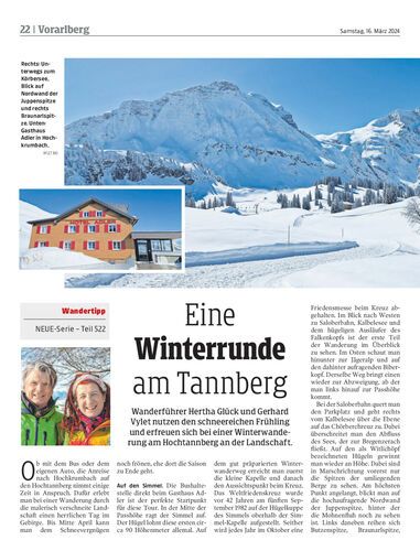 Wanderführer Hertha Glück und Gerhard Vylet nutzen den schneereichen Frühling und erfreuen sich bei einer Winterwanderung am Hochtannberg an der Landschaft.