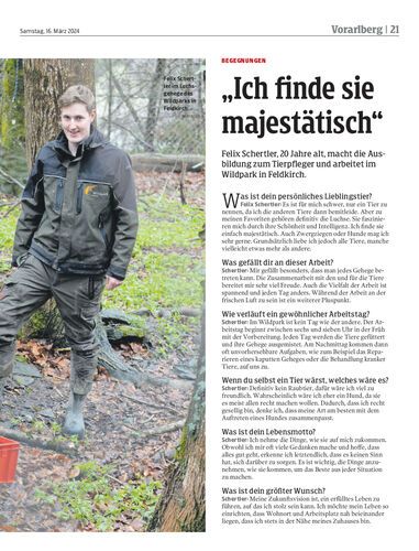 Felix Schertler, 20 Jahre alt, macht die Ausbildung zum Tierpfleger und arbeitet im Wildpark in Feldkirch.