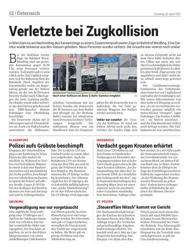 In Wien kam es am Nachmittag des Karsamstags zu einem Zusammenprall zweier Züge im Bahnhof Meidling. Eine Garnitur wurde teilweise aus den Gleisen gehoben. Neun Personen wurden verletzt. Die Ursache war vorerst noch unklar.