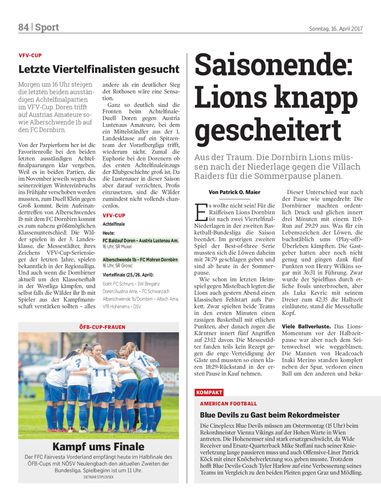 Morgen um 16 Uhr steigen die letzten beiden ausständigen Achtelfinalpartien im VFV-Cup. Doren trifft auf Austrias Amateure sowie Alberschwende 1b auf den FC Dornbirn.