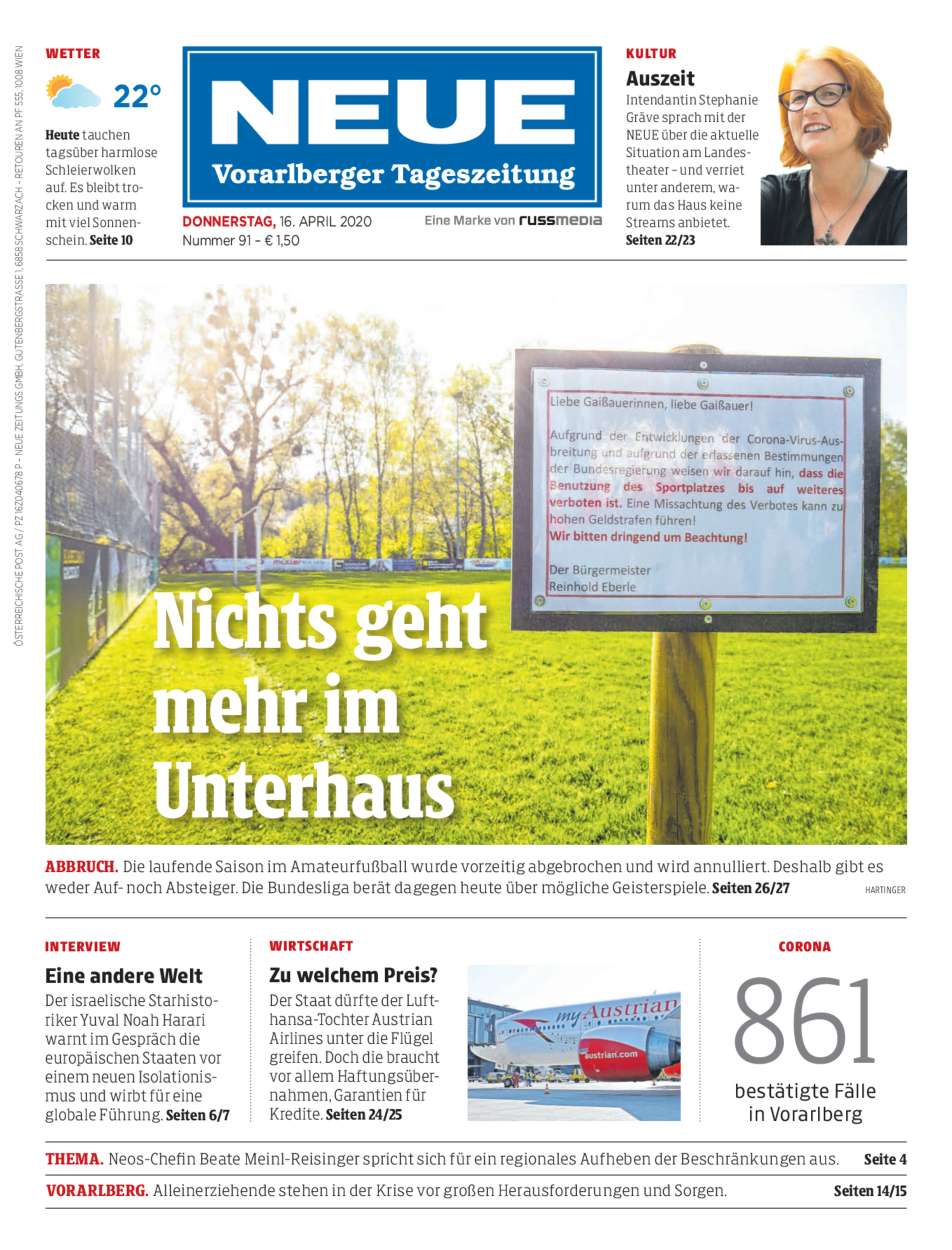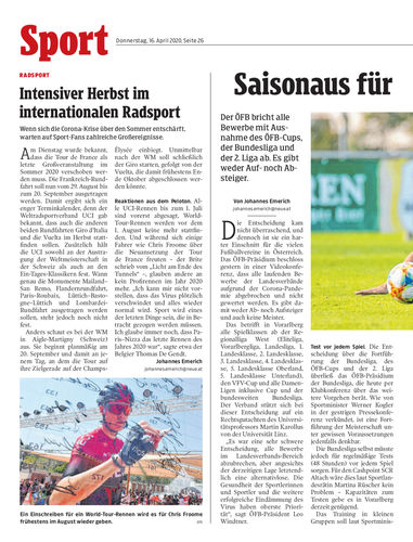 Abbruch. Die laufende Saison im Amateurfußball wurde vorzeitig abgebrochen und wird annulliert. Deshalb gibt es weder Auf- noch Absteiger. Die Bundesliga berät dagegen heute über mögliche Geisterspiele. Seiten 26/27 Hartinger
