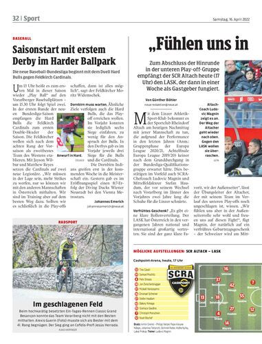 Die neue Baseball-Bundesliga beginnt mit dem Duell Hard Bulls gegen Feldkirch Cardinals.