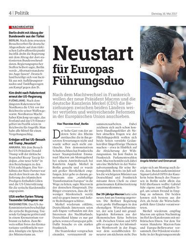 Nach dem Machtwechsel in Frankreich wollen der neue Präsident Macron und die deutsche Kanzlerin Merkel (CDU) die Beziehungen zwischen beiden Ländern weiter vertiefen und weitreichende Reformen in der Europäischen Union anschieben.