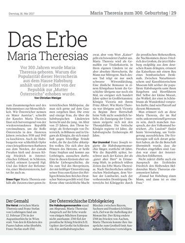 Vor 300 Jahren wurde Maria Theresia geboren. Warum die Popularität dieser Herrscherin aus dem Hause Habsburg anhält und sie selbst von der Republik zur „Mutter Österreichs“ erhoben wurde. Von Christian Weniger