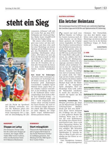 Die Lustenauer Austria trifft heute am vorletzten Spieltag der zweiten Liga um 14.30 Uhr auf Spitzenreiter FC Liefering.