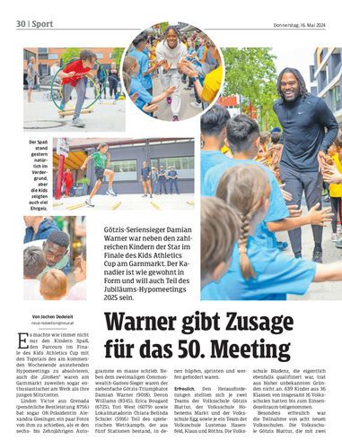 Götzis-Seriensieger Damian Warner war neben den zahlreichen Kindern der Star im Finale des Kids Athletics Cup am Garnmarkt. Der Kanadier ist wie gewohnt in Form und will auch Teil des Jubiläums-Hypomeetings 2025 sein.