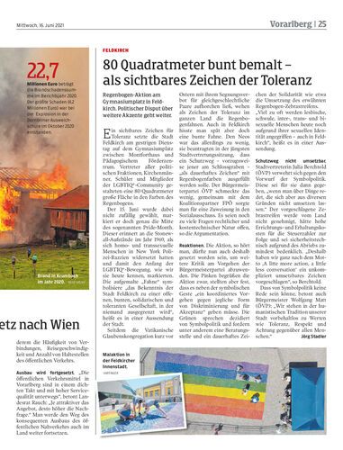 Regenbogen-Aktion am Gymnasiumplatz in Feldkirch. Politischer Disput über weitere Akzente geht weiter.