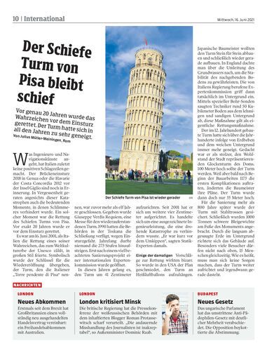 Vor genau 20 Jahren wurde das Wahrzeichen vor dem Einsturz gerettet. Der Turm hatte sich in all den Jahren zu sehr geneigt. Von Julius Müller-Meiningen, Rom