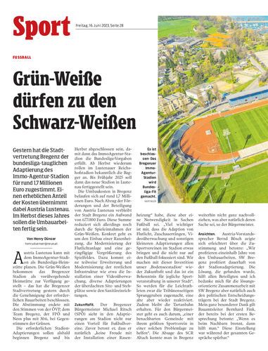 Gestern hat die Stadtvertretung Bregenz der bundesliga-tauglichen Adaptierung des Immo-Agentur-Stadion für rund 1,7 Millionen Euro zugestimmt. Einen erheblichen Anteil der Kosten übernimmt dabei Austria Lustenau. Im Herbst dieses Jahres sollen die Umbauarbeiten fertig sein.