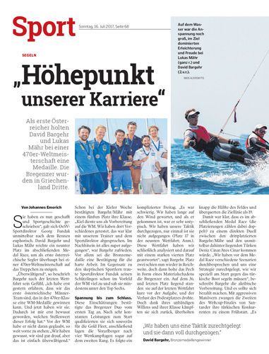 Als erste Österreicher holten David Bargehr und Lukas Mähr bei einer 470er-Weltmeisterschaft eine Medaille. Die Bregenzer wurden in Griechenland Dritte.
