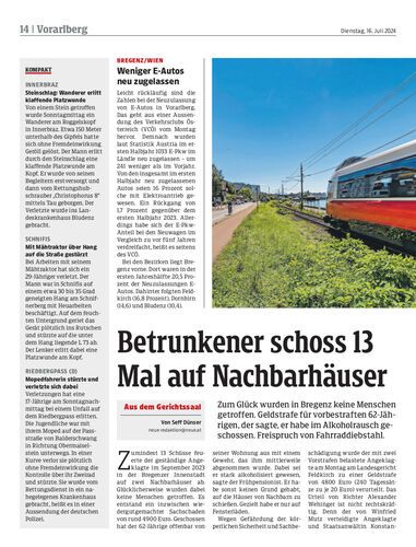 Zum Glück wurden in Bregenz keine Menschen getroffen. Geldstrafe für vorbestraften 62-Jährigen, der sagte, er habe im Alkoholrausch geschossen. Freispruch von Fahrraddiebstahl.