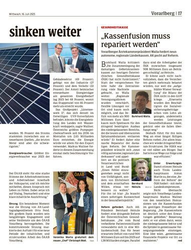 Vorarlberger Ärztekammerpräsident Walla fordert neun autonome, regionale Länderkassen. AK pocht auf Reform.