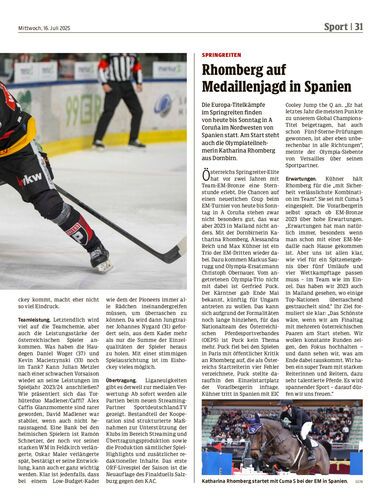 Die Europa-Titelkämpfe im Springreiten finden von heute bis Sonntag in A Coruña im Nordwesten von Spanien statt. Am Start steht auch die Olympiateilnehmerin Katharina Rhomberg aus Dornbirn.