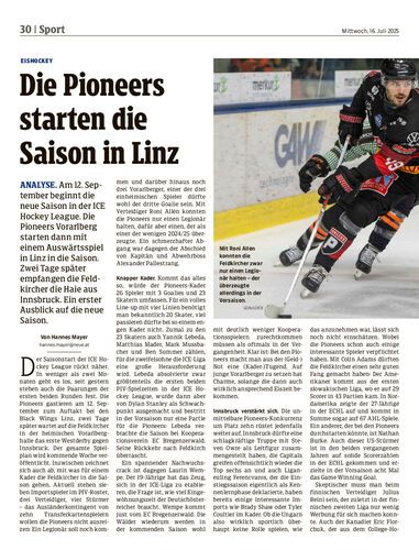 Analyse. Am 12. September beginnt die neue Saison in der ICE Hockey League. Die Pioneers Vorarlberg starten dann mit einem Auswärtsspiel in Linz in die Saison. Zwei Tage später empfangen die Feldkircher die Haie aus Innsbruck. Ein erster Ausblick auf die neue Saison.