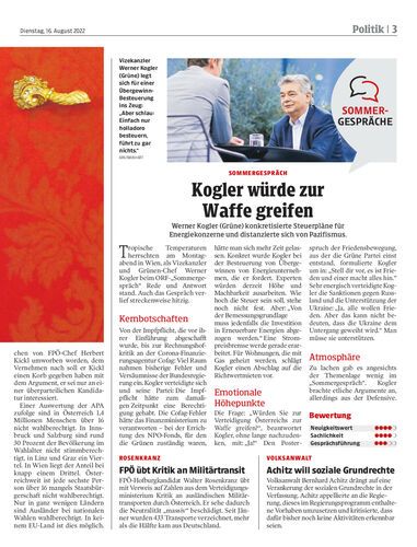 Werner Kogler (Grüne) konkretisierte Steuerpläne für Energiekonzerne und distanzierte sich von Pazifismus.