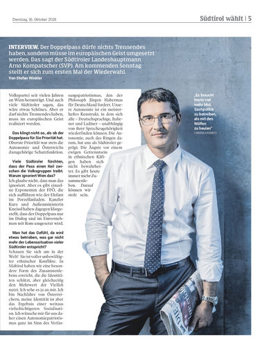 INTERVIEW. Der Doppelpass dürfe nichts Trennendes haben, sondern müsse im europäischen Geist umgesetzt werden. Das sagt der Südtiroler Landeshauptmann Arno Kompatscher (SVP). Am kommenden Sonntag stellt er sich zum ersten Mal der Wiederwahl. Von Stefan Winkler