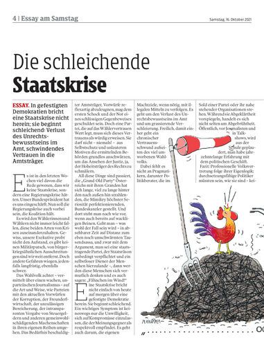 ESSAY. In gefestigten Demokratien bricht eine Staatskrise nicht herein; sie beginnt schleichend: Verlust des Unrechts- bewusstseins im Amt, schwindendes Vertrauen in die Amtsträger.