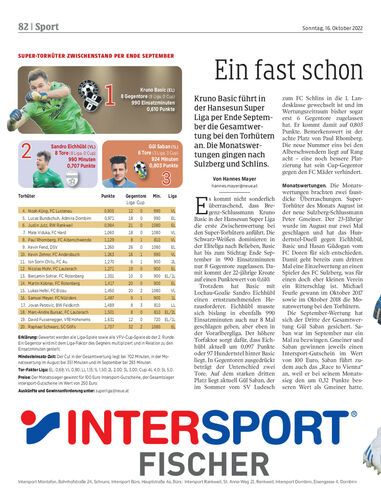Kruno Basic führt in der Hansesun Super Liga per Ende September die Gesamtwertung bei den Torhütern an. Die Monatswertungen gingen nach Sulzberg und Schlins.