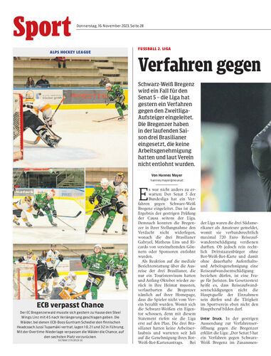 Schwarz-Weiß Bregenz wird ein Fall für den Senat 5 – die Liga hat gestern ein Verfahren gegen den Zweitliga-Aufsteiger eingeleitet. Die Bregenzer haben in der laufenden Saison drei Brasilianer eingesetzt, die keine Arbeitsgenehmigung hatten und laut Verein nicht entlohnt wurden.