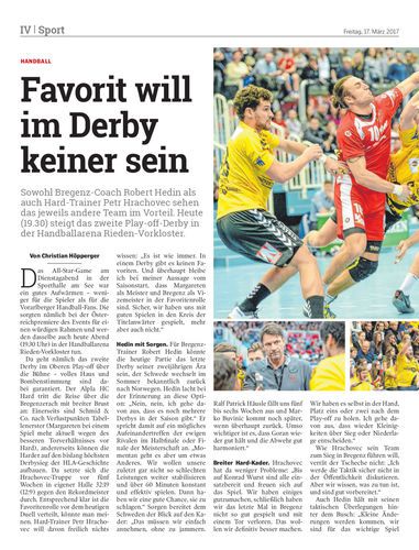 Sowohl Bregenz-Coach Robert Hedin als auch Hard-Trainer Petr Hrachovec sehen das jeweils andere Team im Vorteil. Heute (19.30) steigt das zweite Play-off-Derby in der Handballarena Rieden-Vorkloster.