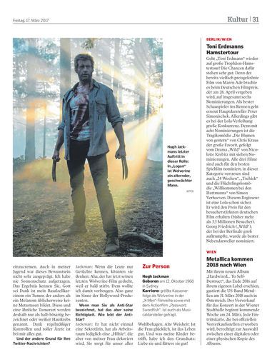 Interview. Hugh Jackman (48) über seinen letzten Einsatz als Wolverine im neuen Kinofilm „Logan“, der derzeit auch in Vorarlberger Kinos zu sehen ist, und den Umgang mit dem Hautkrebs.