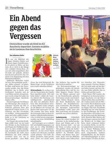 Christa Rose wurde als Kind ins KZ Auschwitz deportiert. Gestern erzählte sie in Lustenau ihre Geschichte.