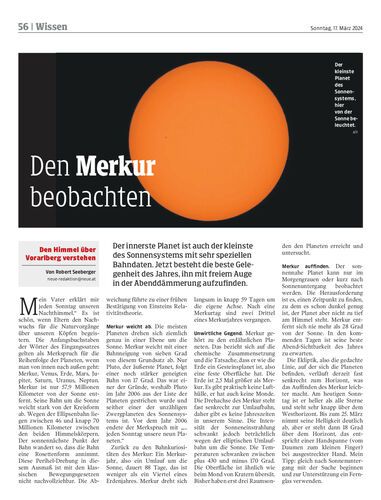 Der innerste Planet ist auch der kleinste des Sonnensystems mit sehr speziellen Bahndaten. Jetzt besteht die beste Gelegenheit des Jahres, ihn mit freiem Auge in der Abenddämmerung aufzufinden.
