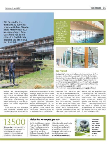 Die Gesundheitseinrichtung Josefhof wurde mit dem Staatspreis Architektur 2021 ausgezeichnet. Dem Gast wird vor allem eines im Gedächtnis bleiben: die Erholung mit Aussicht.