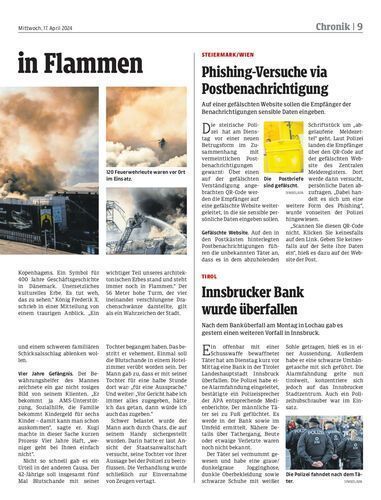 Nach dem Banküberfall am Montag in Lochau gab es gestern einen weiteren Vorfall in Innsbruck.