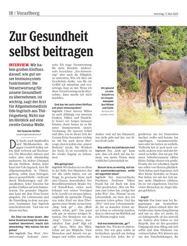 Interview. Wir haben großen Einfluss darauf, wie gut unser Immunsystem funktioniert. Die Verantwortung für unsere Gesundheit zu übernehmen, ist wichtig, sagt der Arzt für Allgemeinmedizin Udo Ingrisch aus Thüringerberg. Nicht nur im Hinblick auf eine zweite Corona-Welle.