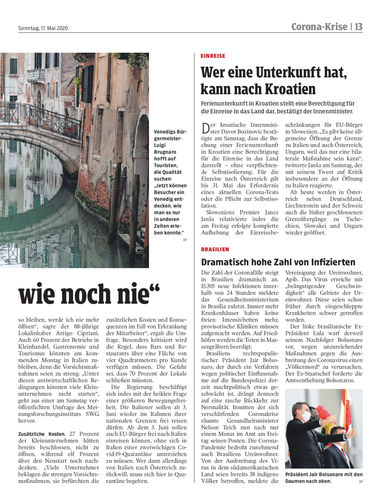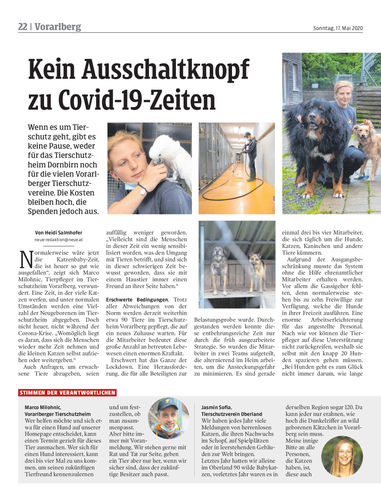 Vorarlberg. Die heimischen Tierheime haben mit den Folgen der Corona-Krise zu kämpfen. Die Spenden blieben aus, und die ehrenamtlichen Helfer durften in den letzten Wochen nicht zu den Tieren. Seiten 22/23 Klaus Hartinger