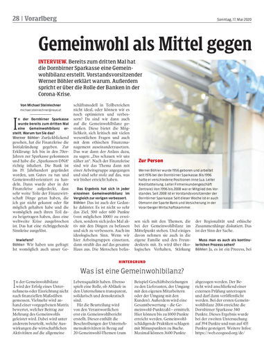 Interview. Bereits zum dritten Mal hat die Dornbirner Sparkasse eine Gemeinwohlbilanz erstellt. Vorstandsvorsitzender Werner Böhler erklärt warum. Außerdem spricht er über die Rolle der Banken in der Corona-Krise.