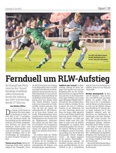 Im Kampf um Platz zwei in der Vorarlbergliga empfängt Alberschwende heute die Admira, der DSV tritt bei Egg (beide 17 Uhr) an.