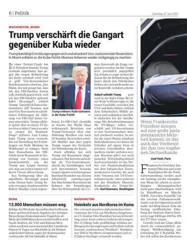 Trump bestätigt Ermittlungen gegen sich und attackiert Vize-Justizminister Rosenstein. In Miami erklärte er, die Kuba-Politik Obamas teilweise wieder rückgängig zu machen.