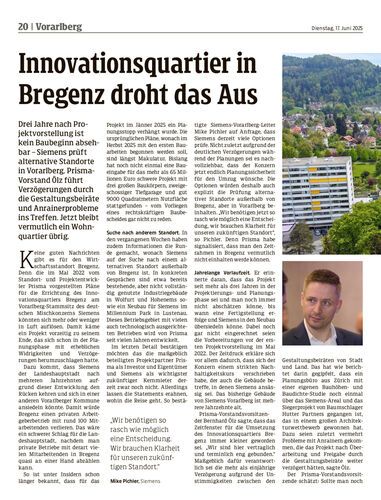 Drei Jahre nach Projektvorstellung ist kein Baubeginn absehbar – Siemens prüft alternative Standorte in Vorarlberg. Prisma-Vorstand Ölz führt Verzögerungen durch die Gestaltungsbeiräte und Anrainerprobleme ins Treffen. Jetzt bleibt vermutlich ein Wohnquartier übrig.
