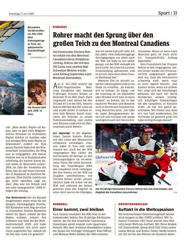 Der Rankweiler Vinzenz Rohrer erhält von den Montreal Canadiens einen Dreijahresvertrag. Rohrer, der mit den ZSC Lions zum zweiten Mal Schweizer Meister wurde, wird Anfang September nach Montreal übersiedeln.